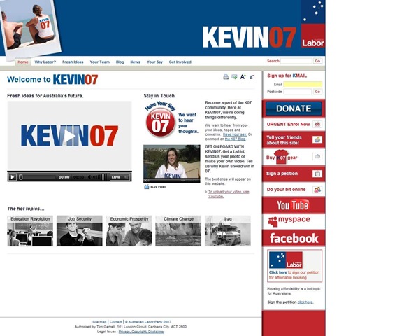 “Kevin07 will encourage supporters to interact with one another, participate in blogs and stay in touch with what is happening on the campaign trail,” Labor’s campaign director Tim Gartrell said.