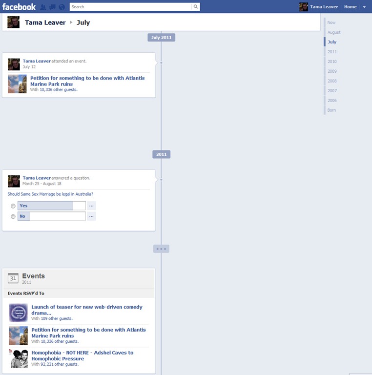 Now, some of the things I’ve said I’ve attended are pretty trivial, but some are political (it’s very clear what my political views are) and others are on the boundary of personal and political. When I voted ‘Yes’ to ‘Should Same Sex Marriage Be Legal In Australia’ I was stating something publicly, but I’d never considered that my response would be so prominent on Facebook (it wasn’t on my profile page very long, for example). Now, for me, this isn’t a big issue; I’ve got sufficient workplace security that I can’t imagine these views would jeopardise my employment, and I stand by my politics proudly. I suspect, though, this won’t be the case for everyone. I can think of numerous scenarios where this information might be misused by other people and I strongly recommend folks take a look at their Timeline view from the public perspective as soon as it’s available to them.