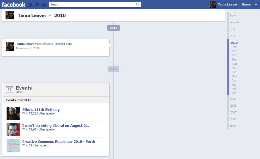On some abstract level, I was aware that when I ‘voted’ or clicked ‘Attending’ I was committing to something that was visible beyond my immediate ‘friend’ network (notable for me since, due to my privacy settings, not much else is). However, most of these actions or events had, from my perspective, long since ‘disappeared’ to the extent that, in order to find them, someone would have to click to ‘load more’ on my Facebook profile page 20 times or more to see anything. Timeline changes that. Now my voting and the public events I attended are very prominent since that’s pretty much the only thing public. And while these were largely very quick responses, these little bits of information suddenly ‘say’ a great deal about me; indeed, for the public, these are the main bits of the story Facebook tells about me.