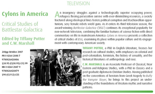 Since I’ve just signed off on editors’ proofs for my chapter in the forthcoming Cylons in America edited collection, I thought I’d paste this little advertisement from Continuum’s 2007 Pop Culture catalogue to remind myself (and anyone else interested) that it should, in fact, be out before the end of the year …