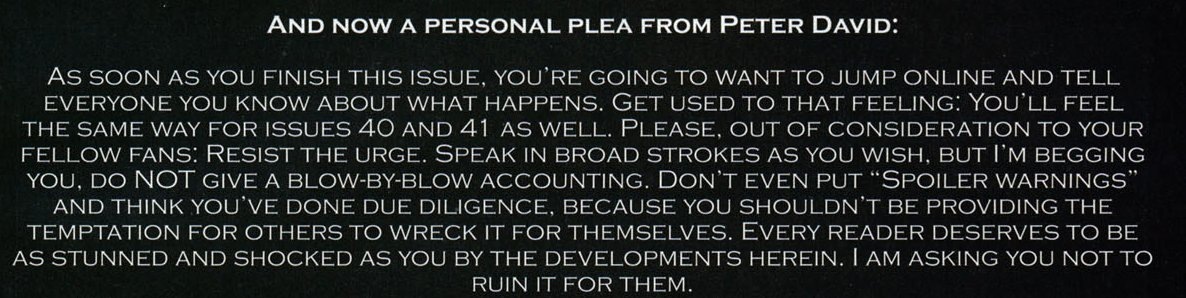 Update: I was reading the comments on Peter David’s website and I thought this one summed up the fan position perfectly: