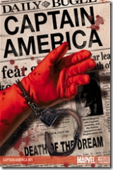 After those impressive beginnings, I was completely stunned at how badly the Marvel wrapped up its Civil War run, with Cap seemingly surrendering on a revelation — that the war between heroes was hurting a lot of innocent people in its wake — so mundane it bordered on stupid. That said, when Cap was actually gunned down by an assassin in Captain America #25, I could see where the story was supposed to have gone (I still think, though, that his death should have occurred in the last issue of the Civil War story, not another tie-in edition, even Cap’s own book). Cap’s death has altered the Marvel Universe, with even Tony Stark (Iron Man) privately admitting that the Civil War wasn’t worth the death of one of Marvel’s greatest icons (in Civil War: The Confession, yet another Civil war spin-off). There has been a lot of press about Marvel killing off one its core characters, but I think these stories are best summed up by Damian Fowler writing in The Guardian‘s books blogs with these insightful thoughts on ‘Why Captain America had to die’: