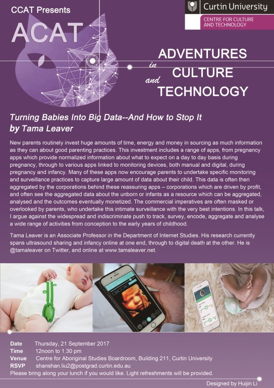 [3] Finally, as part of Research and Innovation Week 2017 at Curtin University, at midday on Thursday 21st September I’ll be presenting a slightly longer version of my talk Turning Babies into Big Data””and How to Stop It in the Adventures in Culture and Technology series hosted by Curtin’s Centre for Culture and Technology. This is a free talk, open to anyone, but please either RSVP to this email, or use the Facebook event page to indicate you’re coming.