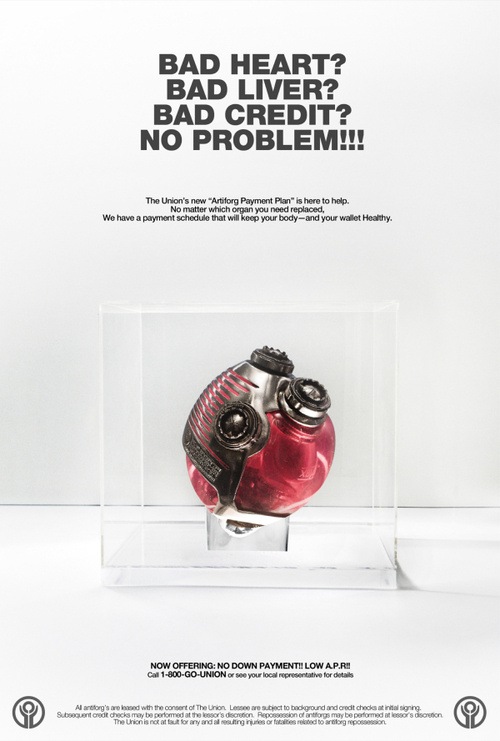 While I fear the upcoming film RepoMen is unlikely to live up the the dystopian promise of its premise (the repossession of artificial organs from people who’ve defaulted on their repayments in a not-too-distant-future), I love some of their promotional posters “¦
