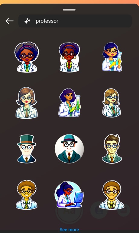 Requesting an AI sticker in Instagram for ‘Professor’ produced a pleasingly broad range of genders and ethnicities. Most generative AI image tools have initially produced pages of elderly white men in glasses for that query, so it’s nice to see Meta’s efforts being more diverse. Queries for ‘lecturer’ and ‘teacher in classroom’ were similarly diverse.