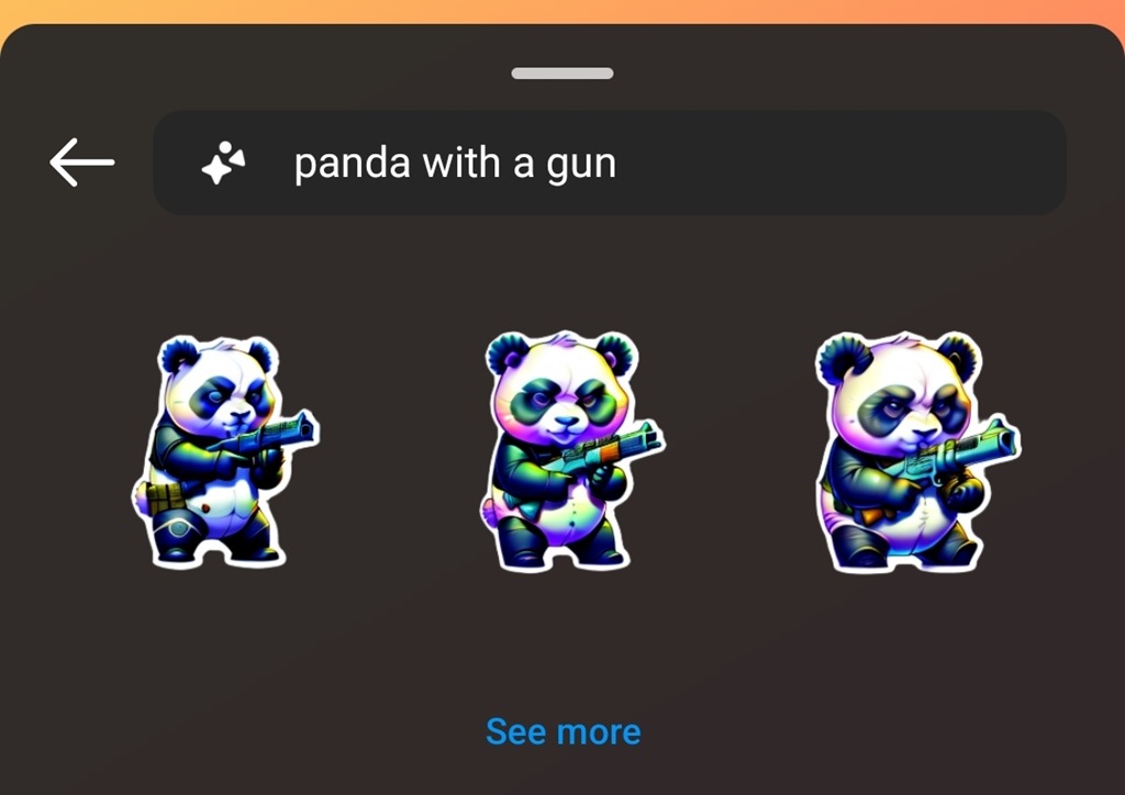 Heading in to slightly more problematic territory, I was curious how Meta’s AI tools were dealing with weapons and guns. Weapons are often covered by safeguards, so I tested ‘panda with a gun’ which produced some pretty intense looking pandas with firearms. After that I tried a term I know is blocked in many other generative AI tools, ‘child with a gun’, and saw my first instance of a safeguard demonstrably in action, with no result and a warning that ‘Your description may not follow our Community Guidelines. Try another description.’