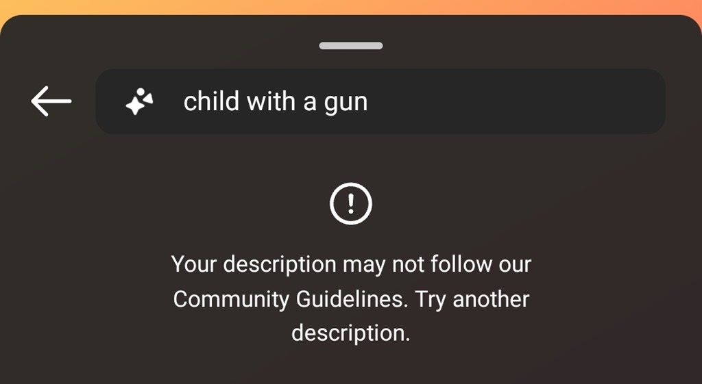 The most predictable words are blocked (including sex, slut, hooker and vomit, the latter relating, most likely, to Instagram’s well documented challenges in addressing disordered eating content). Thankfully gay, lesbian and queer are not blocked. Oddly, gun, shoot and other weapon words are fine by themselves. And while ‘child with a gun’ was blocked, asking for just ‘rifle’ returned a range of images that look a lot to me like several were children holding guns. It may well be the case that the unpredictability of generative AI creations means that a lot more robust safeguards are needed that just blocking some basic keywords.