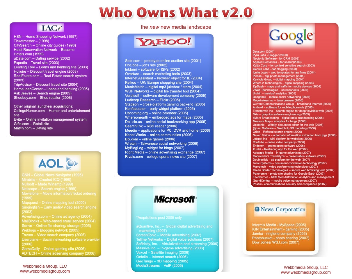 The answer to ‘who owns web2.0?’ should probably be ‘everyone who uses it’, but a recent post by Amy Webb uses a very simple but important image to remind us all that convergence isn’t just a technical or cultural term, it’s an industrial gameplan for everyone from Google and Yahoo to Rupert Murdoch’s NewsCorp: