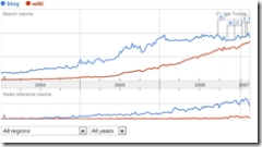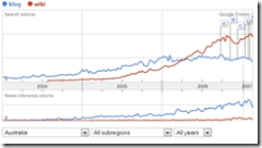 I’ve no idea why wikis are more popular in Australia … perhaps something to do with Wikipedia? I note in the News trends (the smaller bottom graph), blogs are still mentioned a lot more in the mainstream media. I wonder what it is about wikis and Aussies?