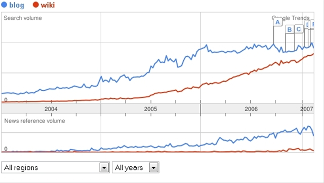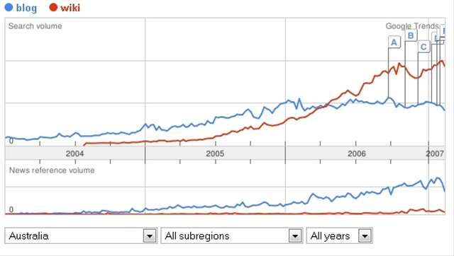 I was playing with Google Trends and their comparison function and noticed that you can now limit searches to regions (ie just Australia, for example). I was playing around looking at the comparative popularity of ‘blog’ versus ‘wiki’ and found something interesting: cumulatively, global searchers are still typing in ‘blog’ more, but in Australia, ‘wiki’ is a more popular term, and has been since the third quarter of 2006. Since there’s no scale on Google Trends, I’ve no numbers attached to these trends, but the results are interesting nevertheless.