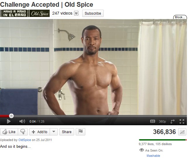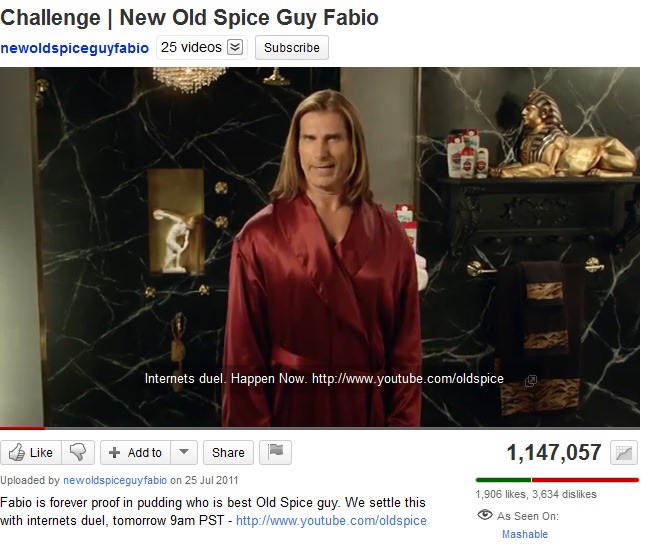 It has been just over a year since Isaiah Mustafa’s Old Spice Man character moved from traditional advertising spaces and conquered the internet with the fantastic rolling campaign of YouTube ‘reply’ videos. I am a huge fan of that 2010 campaign and think it’s still one of the best examples of a dusty brand embracing participatory culture completely and reaping the rewards. This week, the next iteration in that social media campaign has kicked off, with cultural manhood cliché Fabio attempting to wrestle away Mustafa’s Old Spice man crown. Mustafa accepted the challenge and now a ‘battle’ rages ‘Live at Internet Stadium’ with the two both replying to challenges and comments from participants online.