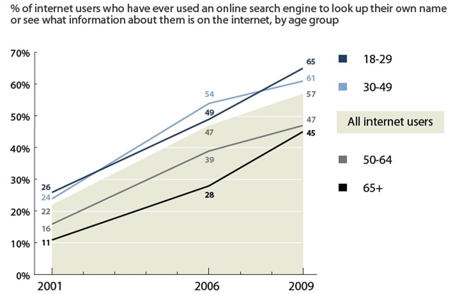 This result is particularly interesting for two reasons: firstly, it shows that across the board, interest in our own web presences has increased dramatically across the last decade; and secondly, it highlights that younger adults (those 18-29) appear to be the most concerned with their online reputation. As danah boyd celebrated earlier today, this result really undermines the cultural myth that younger people are the least interested with online privacy. Obviously this survey excludes people under-18, but it’s fair to assume that part of the process of growing up these days includes becoming sensitised to the importance of being aware of our web presence.
