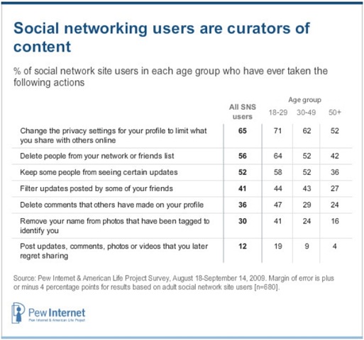 Similarly, the Pew report also highlights the face that younger people are the most active in controlling their presence online, insomuch as they are most likely to have changed their privacy settings on social networks, they are the most likely to untag a photo of themselves, and so forth:
